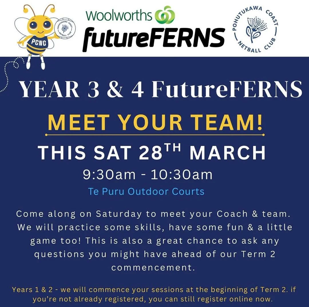 Teams train locally at Te Puru sports complex and play on Saturdays at the Howick Pakuranga Netball Centre.